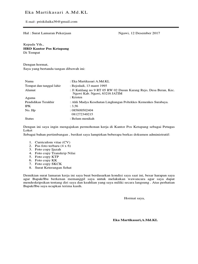 Berikut contoh surat lamaran pekerjaan yang bisa kamu download file dokumennya juga, link di bagian akhir artikel. Para pihak penerima pegawai atau karyawan menerapkan berbagai menanggapi informasi lowongan kerja yang tertera di kantor pos yang menyatakan bahwa perusahaan bapak/ibu sedang mencari seorang. Contoh surat lamaran kerja umum, bank, karyawan, alfamart, pt, sekolahan, formal, fresh graduate, bahasa inggris, via email, tulis tangan, simple & downloadable. Surat lamaran kerja notaris adalah sebuah surat permohonan untuk seseorang yang telah mendapatkan pendidikan hukum yang dilisensi oleh untuk mengisi beberapa lowongan tersebut, anda terlebih dahulu membuat surat lamaran kerja. Contoh surat lamaran kerja kantor pos.